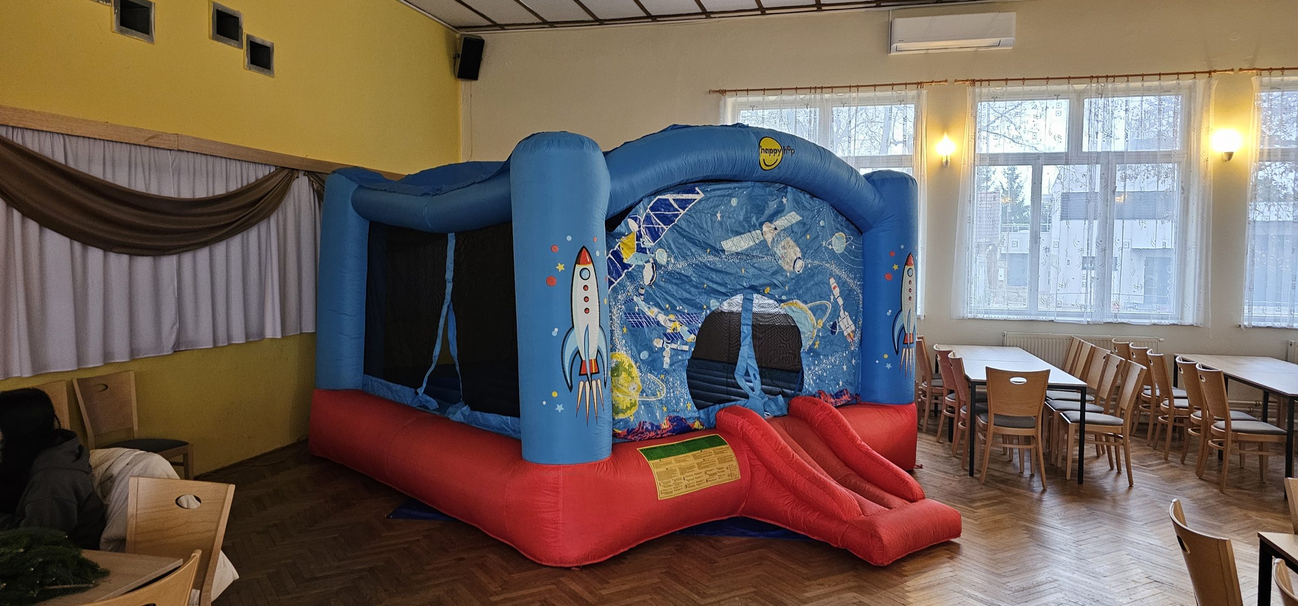 Skvělý skákací hrad Vesmír má podlahovou plochu 18 m² a obrovský skokanský areál s mimořádně širokou skluzavkou, na níž se mohou současně sklouznout 2 děti.
